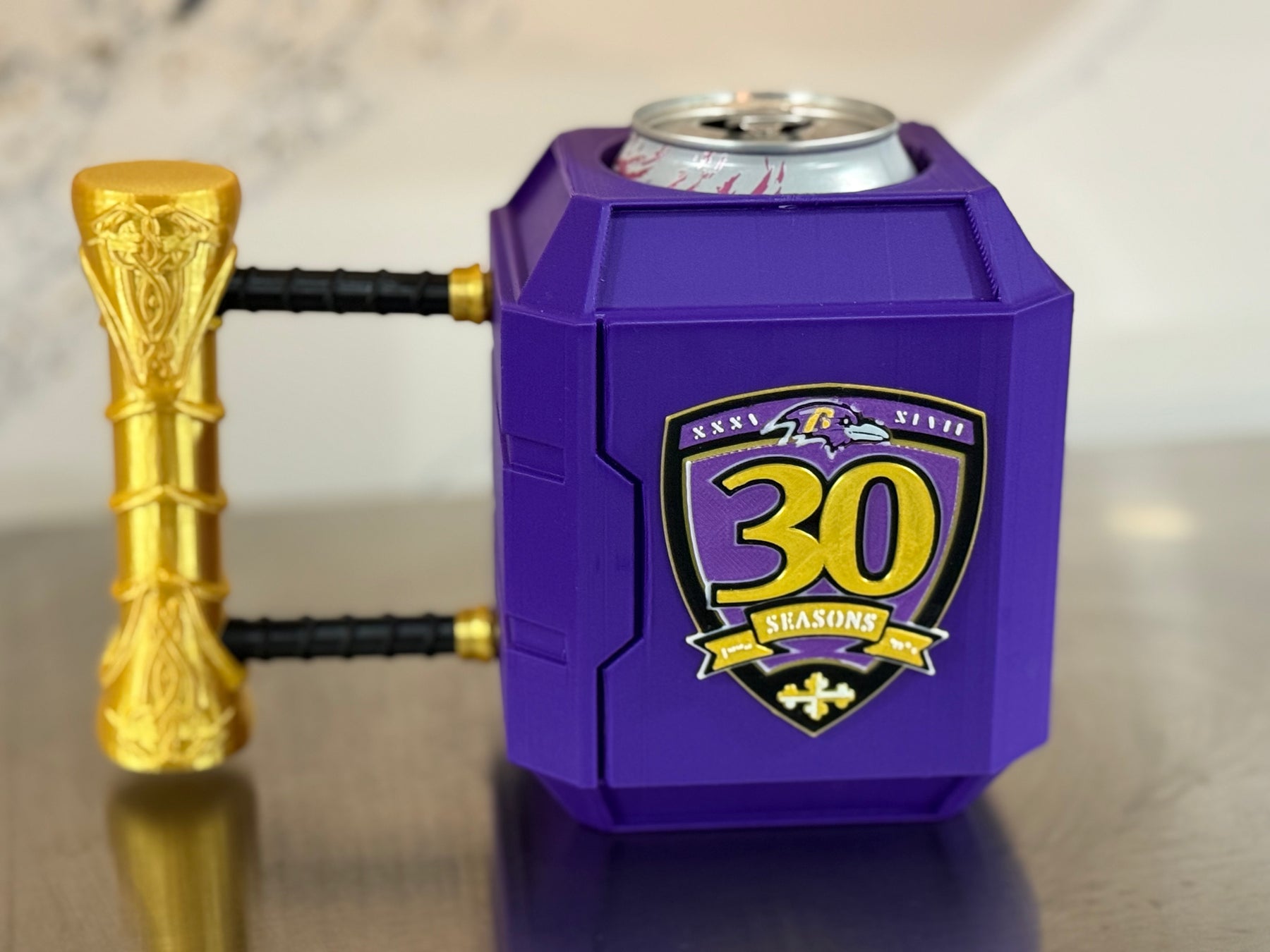 Hand-crafted with premium 3D-printed detail, this unique can holder features a bold Ravens 30 Seasons emblem, metallic gold accents, and a sculpted hammer handle for an epic grip. Whether you’re raising a cold drink or raising hell for your team, this can holder brings instant hype to any moment.