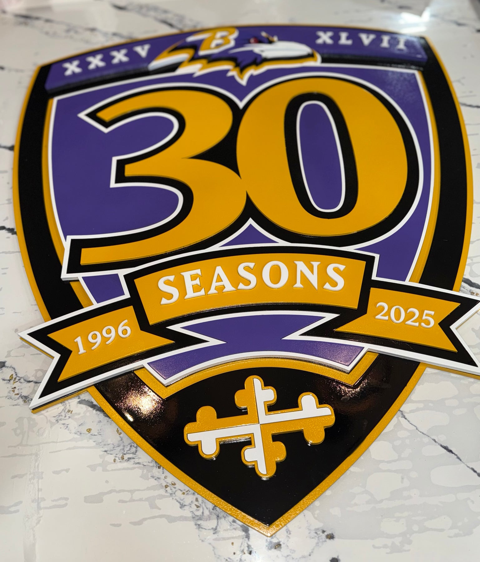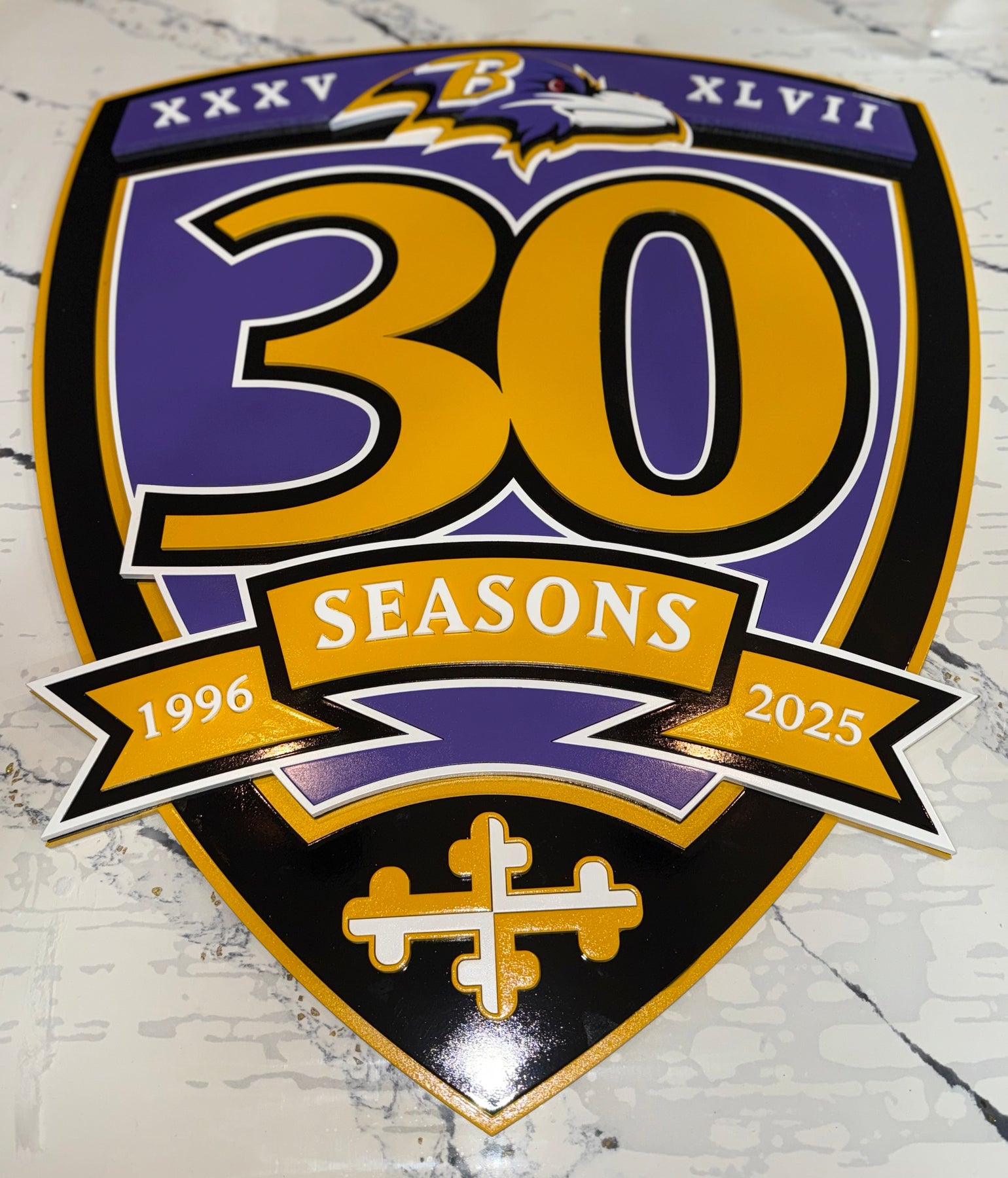 Celebrate 30 incredible seasons of Baltimore Ravens football with this custom handcrafted wood shield sign!